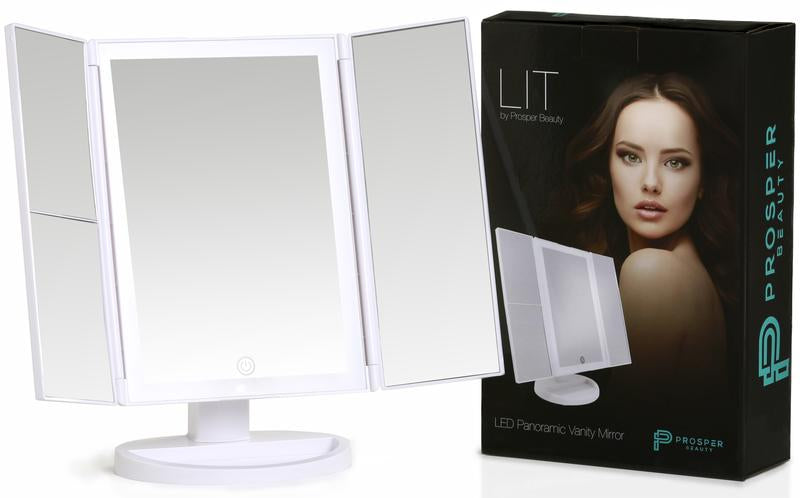 LIT is a new LED panoramic vanity mirror that features surrounding LED light strips providing the best and brightest light coverage. Also included are folding 2x and 3x magnifying side mirrors, dual power options via USB or battery powered, and is fully adjustable and compact. Convenient features makes it the perfect travel mirror, yet will look fabulous sitting at your makeup station. This versatile vanity mirror is a classic that will never go out of style!